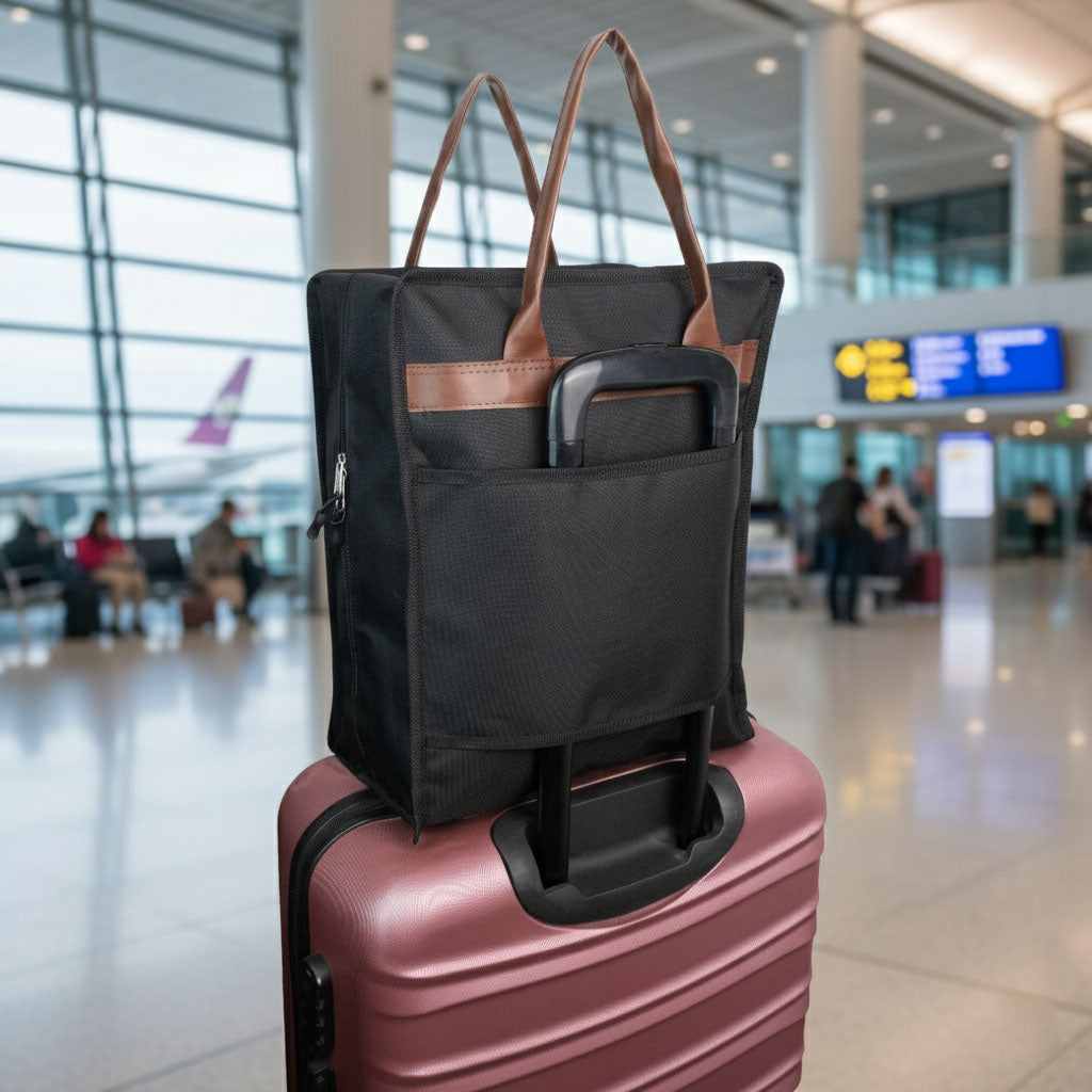 Yes — the bag includes a rear luggage sleeve, allowing you to easily slide it over your suitcase or roller bag handle for hands-free travel.